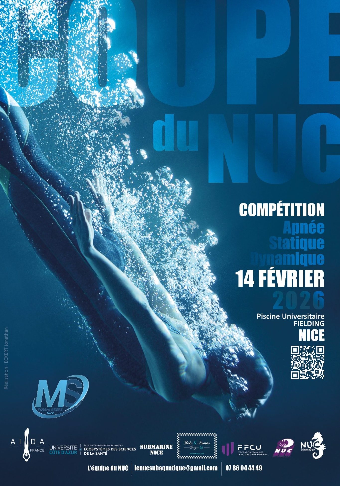 Comme chaque année, cette compétition d'apnée Indoor AIDA est organisée par le NUC Subaquatique, avec la précieuse aide des étudiants bénévoles de l'Option Mer de la Faculté des Sports à Nice.