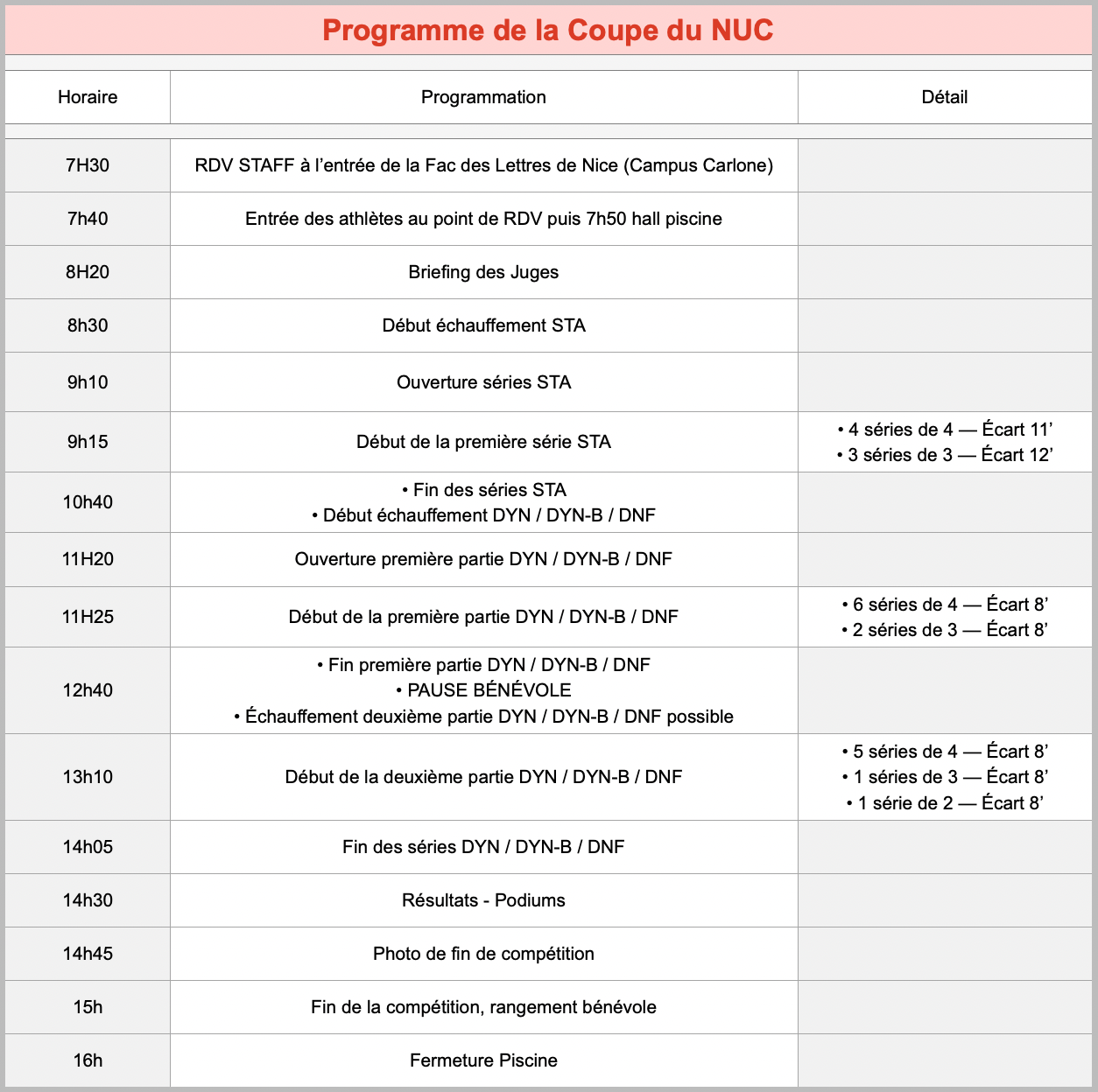 Nous vous donnons rendez-vous de 8h à 16h à la Piscine Fielding du Campus Carlone de Nice, au niveau du portail à gauche du restaurant universitaire.